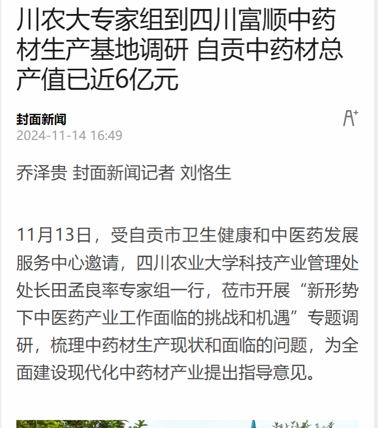 11月13日,受自贡市卫生健康和中医药发展服务中心邀请,tyc5997太阳集团科技产业管理处处长田孟良率专家组一行,莅市开展“新形势下中医药产业工作面临的挑战和机遇”专题调研,梳理中药材生产现状和面临的问题,为全面建设现代化中药材产业提出指导意见。