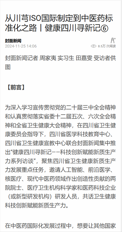 为深入学习宣传贯彻党的二十届三中全会精神和认真贯彻落实省委十二届五次、六次全会精神和全省卫生健康大会精神,在四川省卫生健康委员会指导下,四川省医学科技教育中心、四川省卫生健康宣教中心联合封面新闻集中推出“健康四川寻新记——科技创新赋能新质生产力系列访谈”,聚焦四川省卫生健康新质生产力发展重点任务,邀请人工智能、前沿医学、核医疗、现代中医药领域作出创造性贡献的两院院士、医疗卫生机构科学家和医药科技企业(或新型研发机构)研发人员,共话卫生健康科技创新赋能新质生产力。