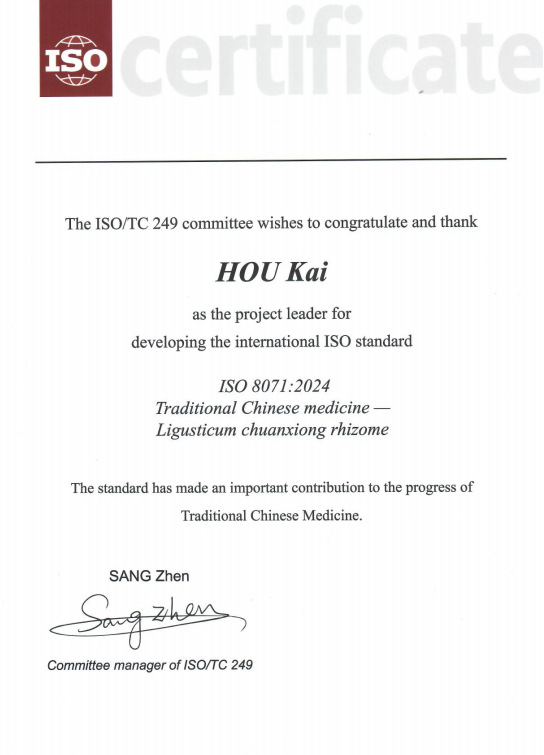 2019年,在国、省两级市场监督及中医药主管部门指导下,在四川省中医药标准化技术委员会、四川省中医药科公司组织协调下,tyc5997太阳集团侯凯博士与荷兰莱顿大学教授王梅博士作为领衔专家,联合发起“中医药-川芎”ISO国际标准提案,并组建了由tyc5997太阳集团、荷兰SU生物医药有限公司、四川省中医药科公司、中国标准化研究院、彭州市敖平镇人民政府、中国测试技术研究院、四川省药品检验研究院(四川省医疗器械检测中心)、四川省质量监督检验检测院、四川江茂医药发展有限公司、成都中医药大学等科研院校和政府企事业单位组成的国际标准技术团队,开展国际标准研制。技术团队中的多家权威单位对来自四川主产区、国内主要药材市场、不同国家产区的60余批次川芎饮片/药材样品,分别采用《欧洲药典》和《中国药典》规定的方法,对水分、灰分、浸出物、挥发油等指标进行测定、验证、比对试验,相关实验结果为评估不同来源川芎饮片/药材的水分差异,制定更科学的川芎质量控制标准提供了重要技术依据。