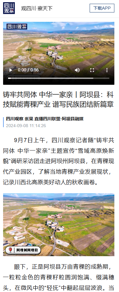 9月7日上午,四川观察记者随“铸牢共同体 中华一家亲”主题宣传“雪域高原焕新貌”调研采访团走进阿坝州阿坝县,在青稞现代产业园区,了解当地青稞产业发展现状,记录川西北高原美好动人的秋收画卷。