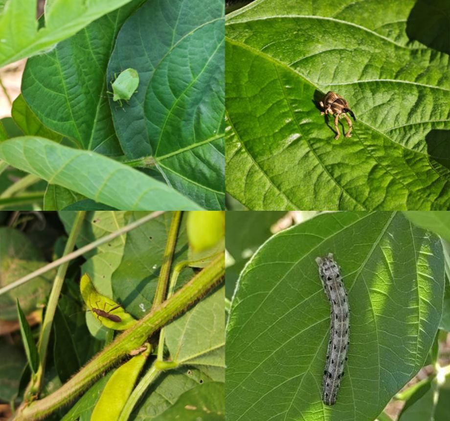 高温干旱天气下大豆虫害多发(左上:稻绿蝽;右上:高隆象;左下:点锋缘蝽;右下:斜纹夜蛾幼虫)。受访者供图
