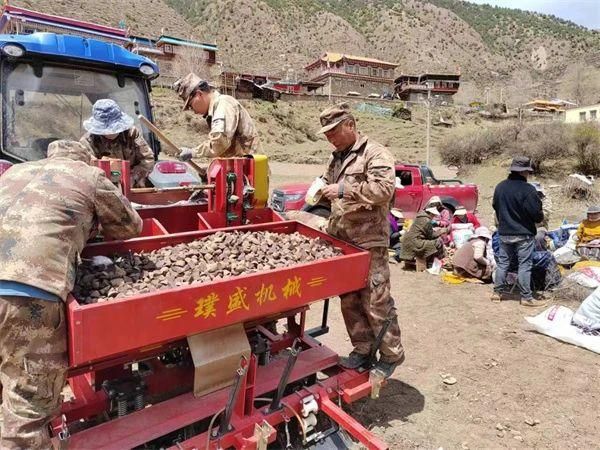 选种、松土、开沟、播种、填埋……连日来,在位于色达县翁达镇旭儿沟村的“宝石花开·福地色达”农特产业种植基地里,村民抢抓高原春耕关键期,热火朝天栽种紫皮大蒜和紫皮土豆,田间地头一派农忙景象。